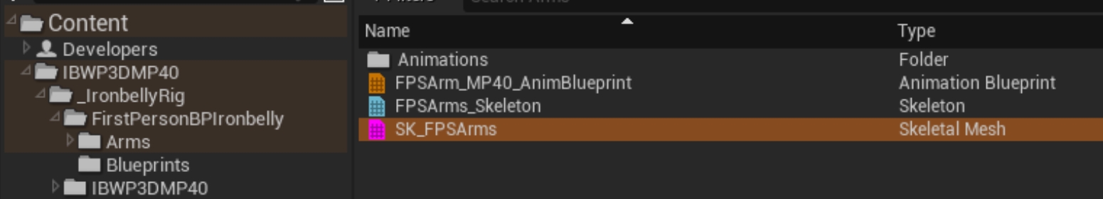 Now that we have the Asset Pack in the project, we need to find the arms Skeletal Mesh. In the case of the asset we picked, this is at: IBWP3DMP40/_IronbellyRig/FirstPersonBPIronbelly/Arms/SK_FPSArms.uasset